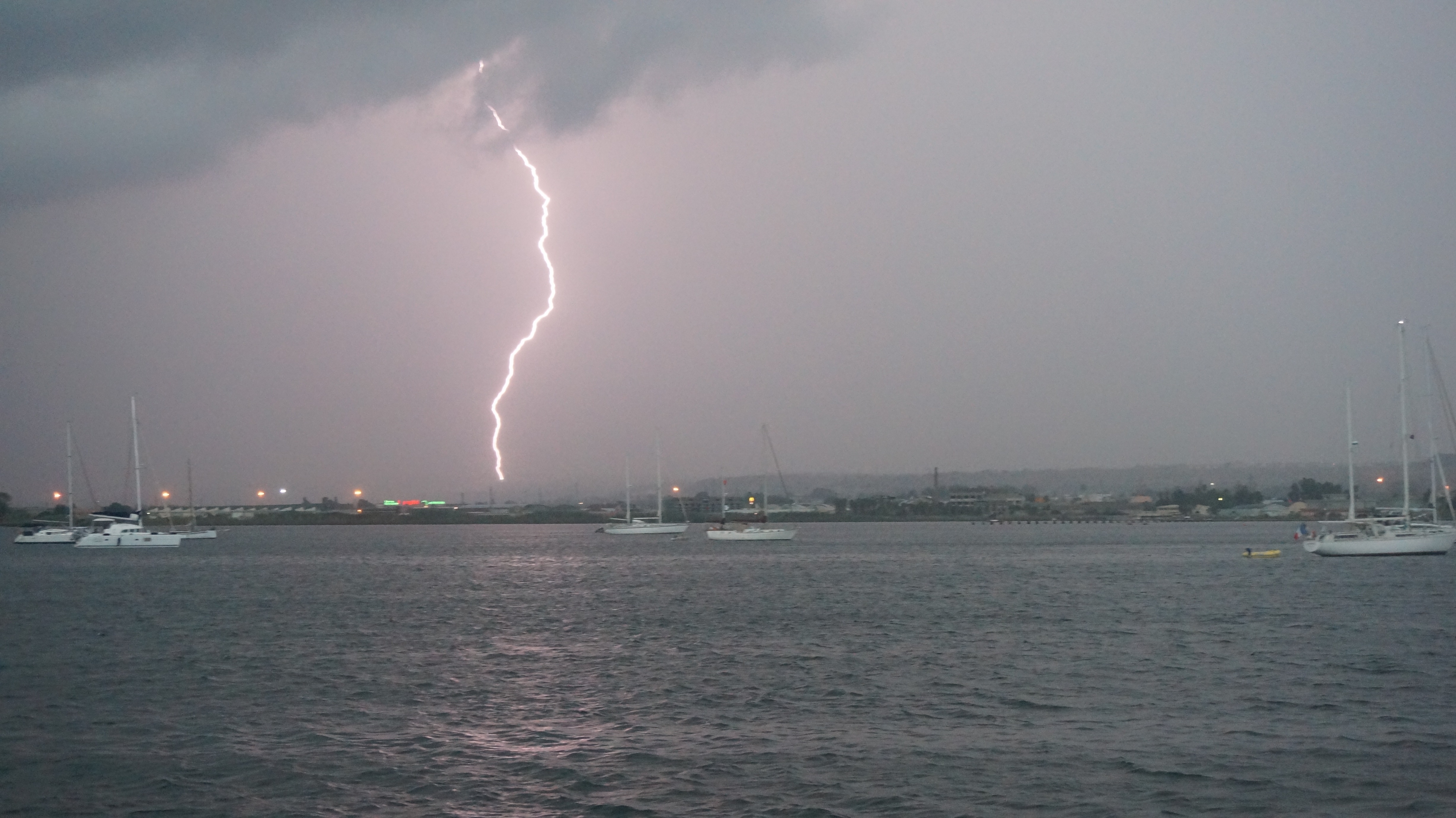 Lightening storm hit as we were setting the hook. Lucky me, I get to drive while Neal works the anchor. Me dry, Neal wet.
