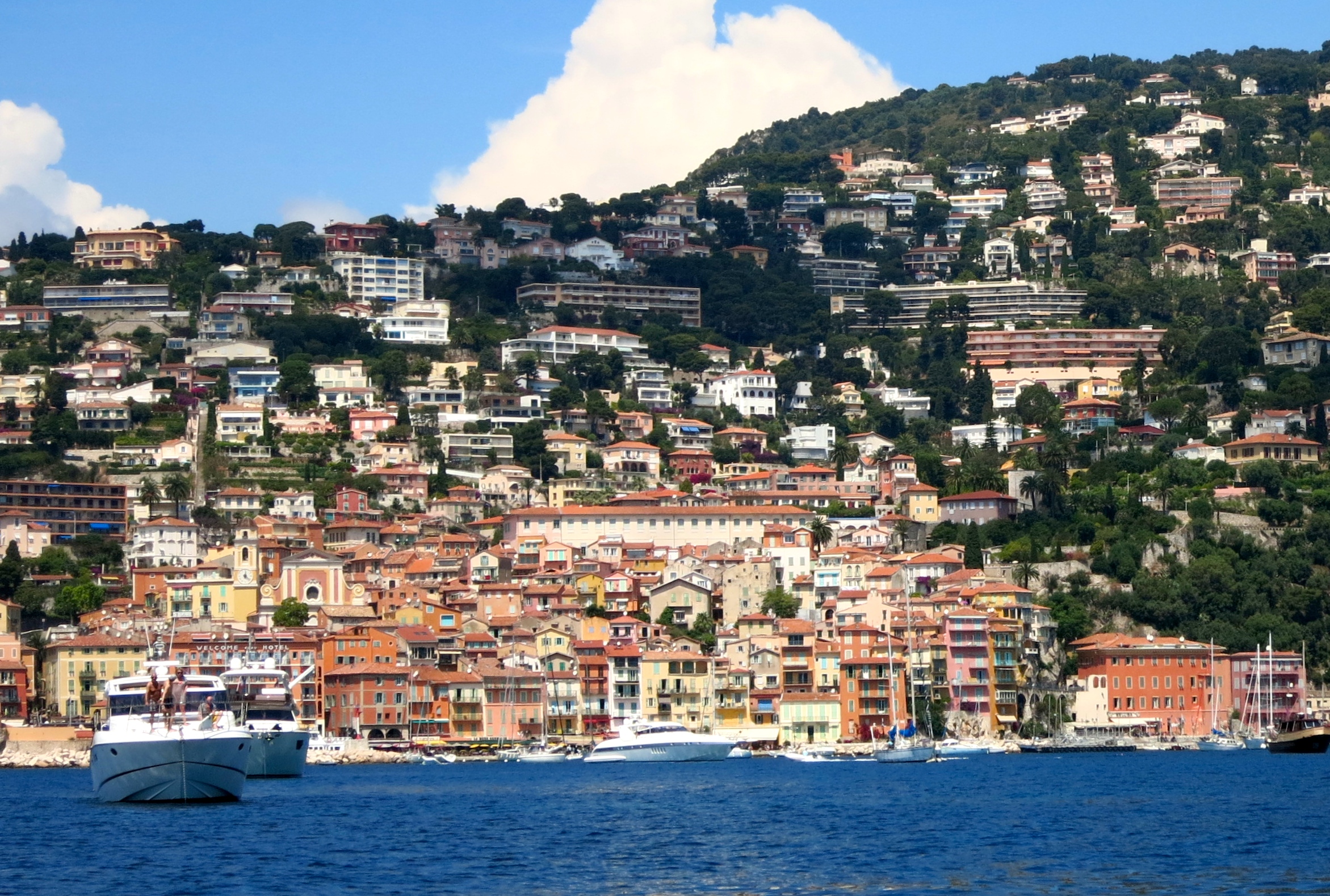Not far east of Antibes is the peninsula of Cap Ferrat. Villefrance Sur Mer is just on the other side, both bays providing decent shelter in calm weather. Both of these places are surrounded by stunning hills and white limestone, with dark green trees and roads snaking up the mountains.
