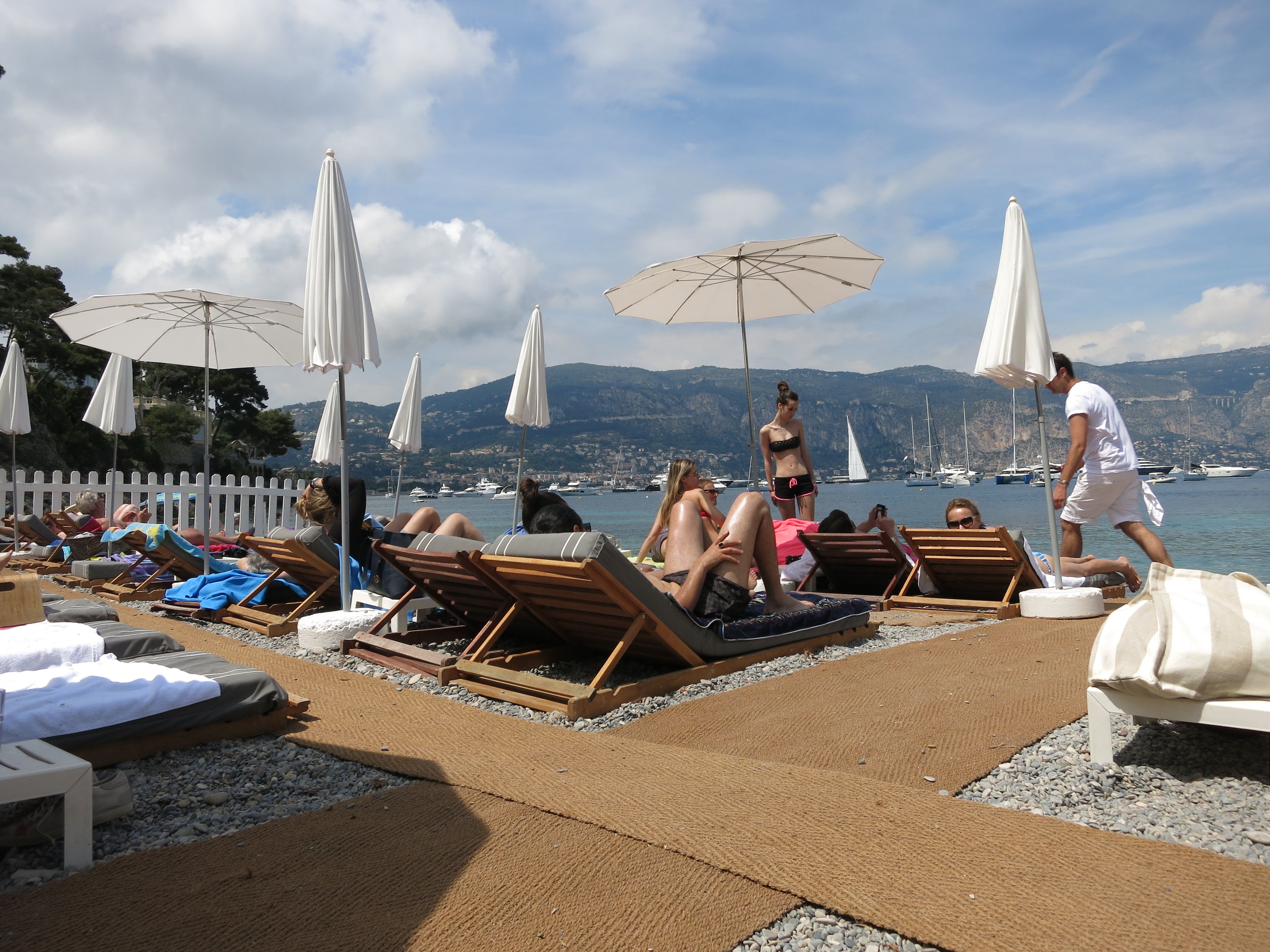 The anchorage in Villefrance was a bit rolly, but for Cap Ferrat we stayed in the marina. Since I had been sick for the entire time we have been sailing, I was ready for a rest day. We walked towards the beach, thinking to stay a couple of hours in the sun, but instead splurged for chairs and umbrellas at Paloma Beach Club, a swanky beach club with chairs, a nice restaurant, and a staff of about 20 youngsters delivering food and drinks. We stayed the whole day. Rosé on the beach. Bliss!