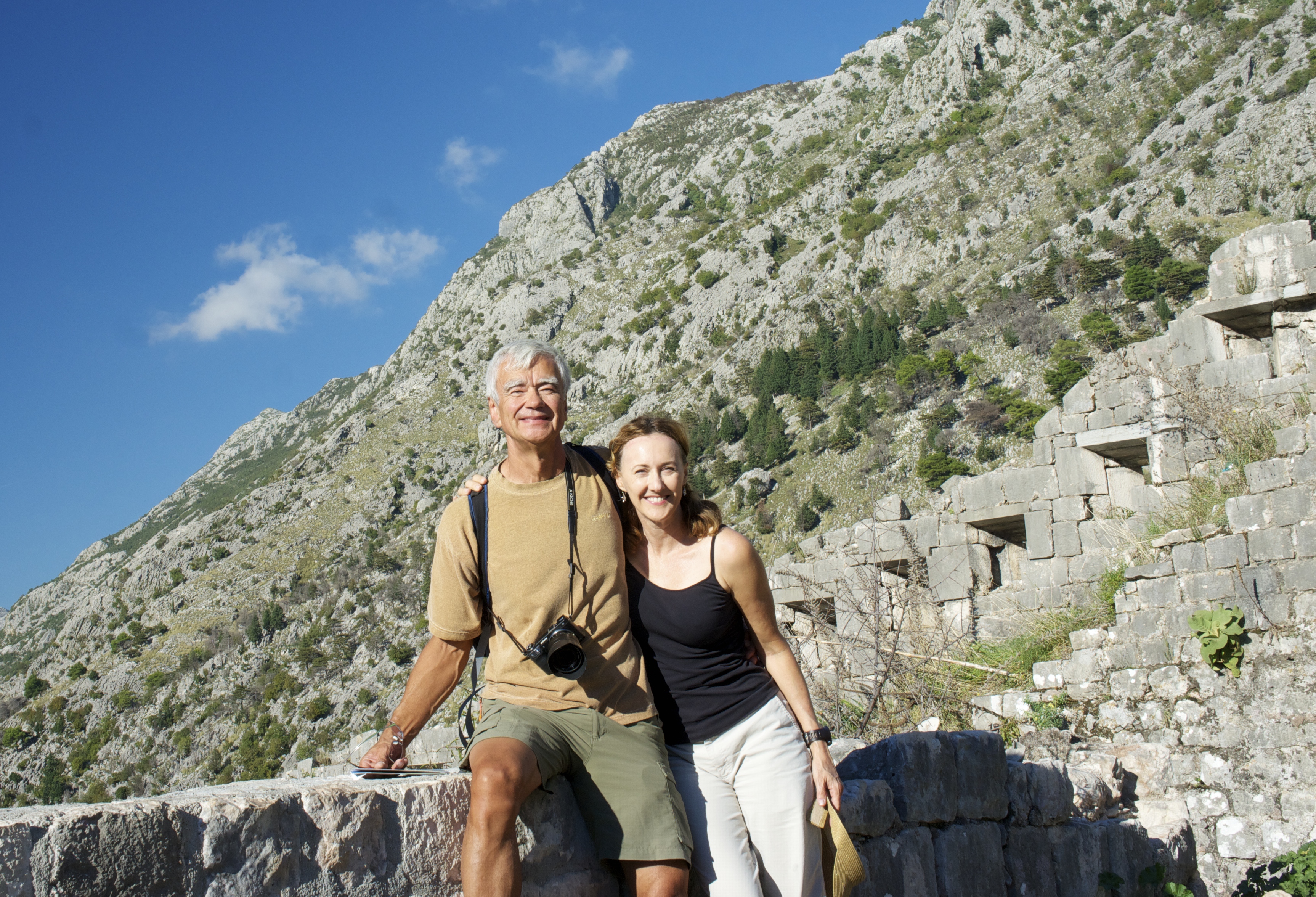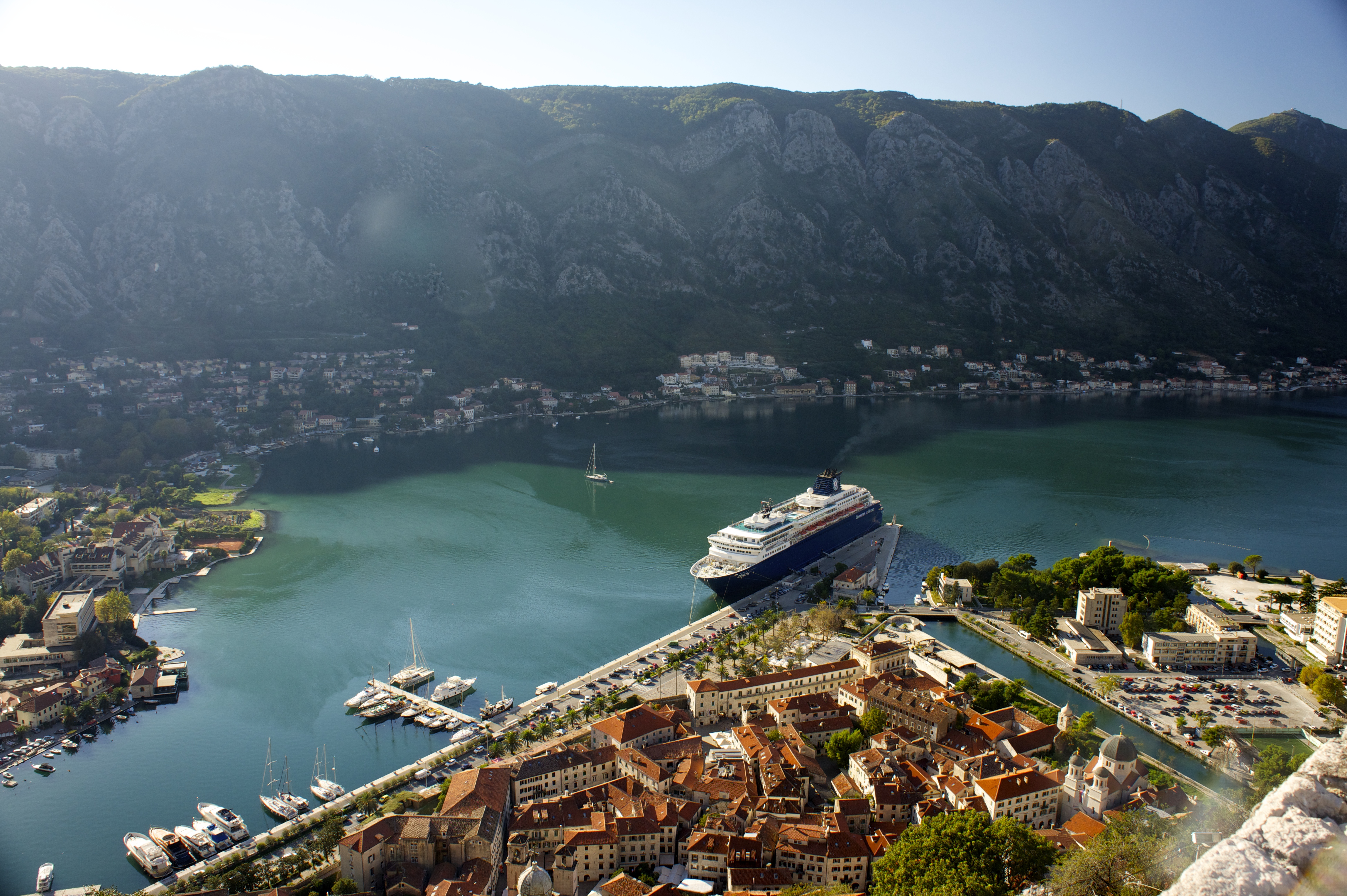 We sent one night in Kotor harbor, climbed the city walls to the fortress, and looked down on tiny Amante, next to the cruise ship in the harbor.