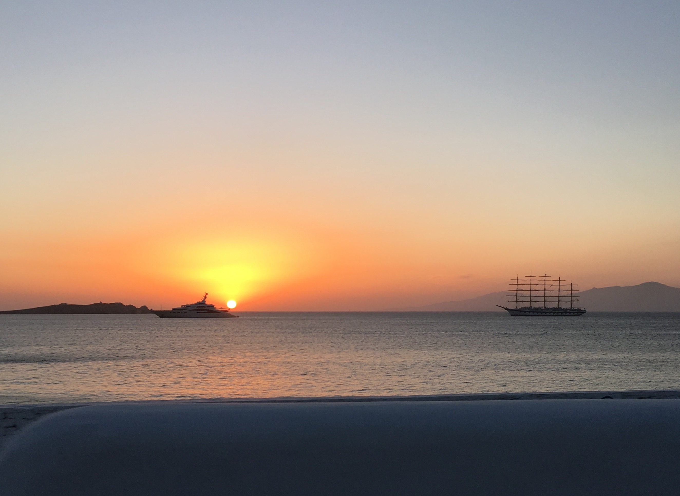 weather from the south led us to Mykonos, to a bay that rents wind surfing equipment- a bay that in normal, prevailing northerlies conditions is untenable as an anchorage. Our sailing mentors Mary and Larry on Berkeley East were also there, so INSTANT HYLAS RENDESVOUS!! Although they were headed south and we are headed east, thr weather, who always wins, suggested Mykonos for a few days.