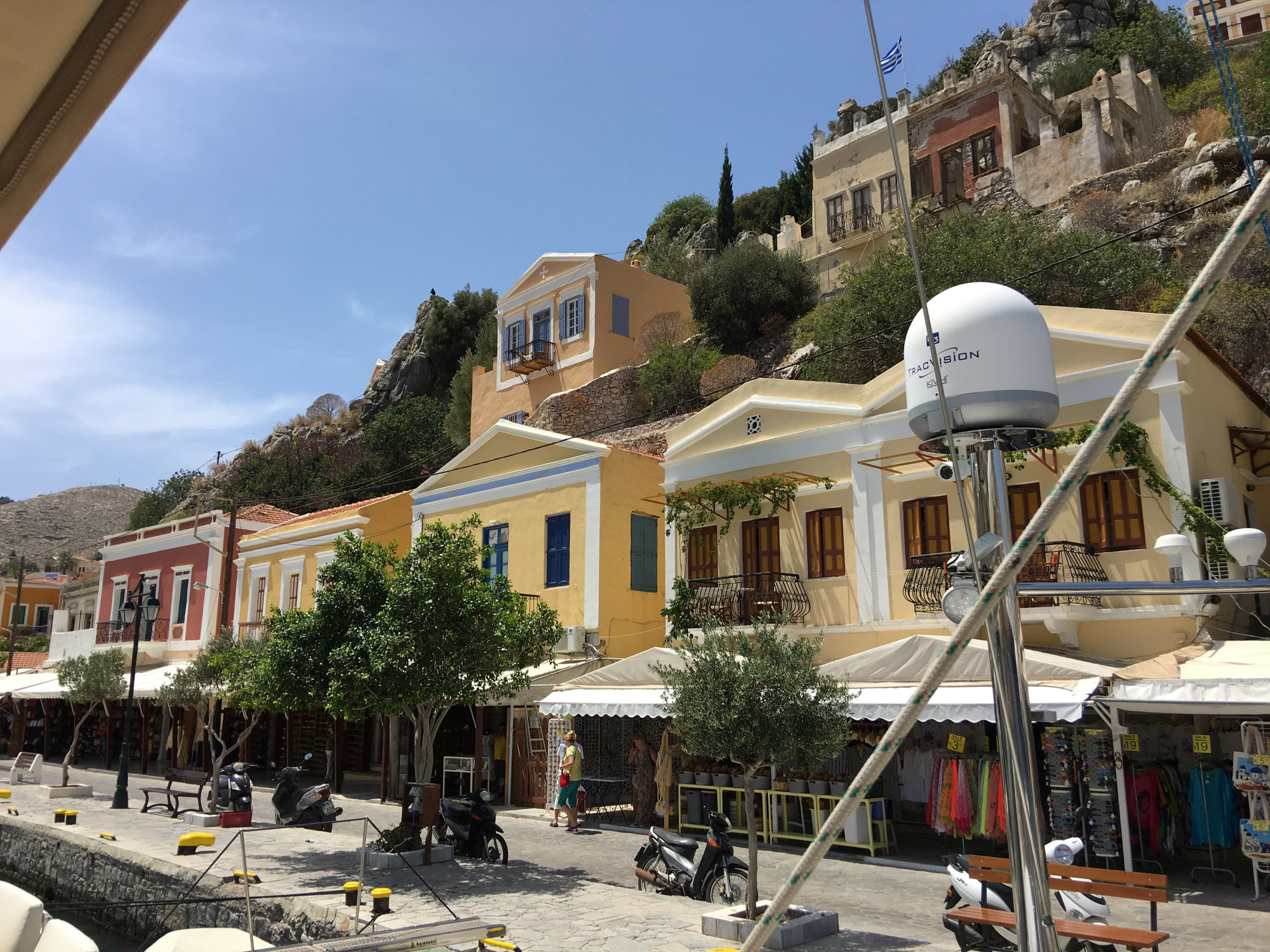 So we wrote that down and promptly forgot it. Good thing we didn’t have to go on the customs dock! But while Symi harbor is one of the most beautiful harbors this side of Bonifaccio, surrounded by steep hillsides of pastel colored Italian style homes, it is very narrow. After mooring we could walk steps to the shops and cafés.